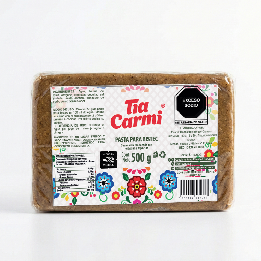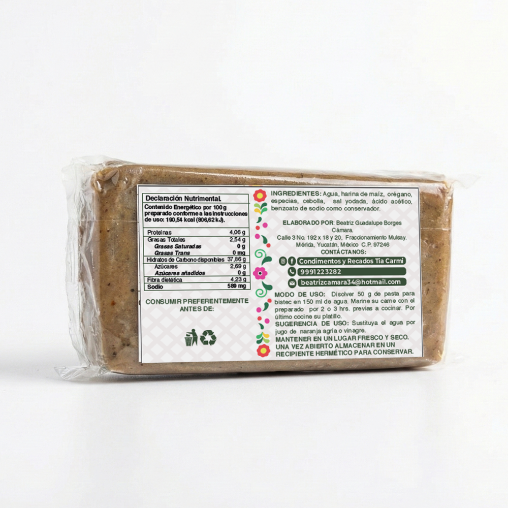 Pasta para bistec / Recado Blanco Yucateco Tradicional Tia Carmi 1 kg La Pasta para Bistec Tia Carmi 1 kg es ideal para quienes cocinan con frecuencia o a gran escala. Ideal para restaurantes, negocios de comida, eventos o familias numerosas que buscan rendimiento, consistencia y sabor auténtico en cada platillo. Nuestra Pasta para Bistec Tia Carmi, también conocida como recado blanco, es el secreto de la cocina yucateca para lograr carnes jugosas, bien sazonadas y llenas de sabor. Elaborada con una mezcla balanceada de especias tradicionales, esta pasta realza el sabor natural de la carne sin opacarlo, brindando ese toque casero que sabe a hogar y tradición. Perfecta para bistec de res o cerdo, pollo, chuletas o incluso verduras asadas. Solo unta, cocina y deja que el aroma te transporte directo a la cocina de la abuela… ¡Mare, qué delicia! Beneficios Receta tradicional yucateca Sabor suave, equilibrado y auténtico Ideal para uso diario o comidas especiales Lista para usar, sin complicaciones Rinde mucho y se integra fácilmente a tus platillos Elaborada con ingredientes seleccionados Elaborado en México Usos sugeridos Bistec de res o cerdo Pechuga de pollo Chuletas Verduras salteadas o asadas Carnes al horno, parrilla o vapor Recetas tradicionales y reinterpretaciones modernas Modo de uso Disuelve la pasta con jugo de naranja agria o naranja con limón, sal al gusto y marina la proteína de 2 a 3 horas previas y cocina a fuego lento para un sabor auténtico. Y ¡a disfrutar! Ingredientes: Orégano yucateco y especias tradicionales. Contenido neto: 1 kg